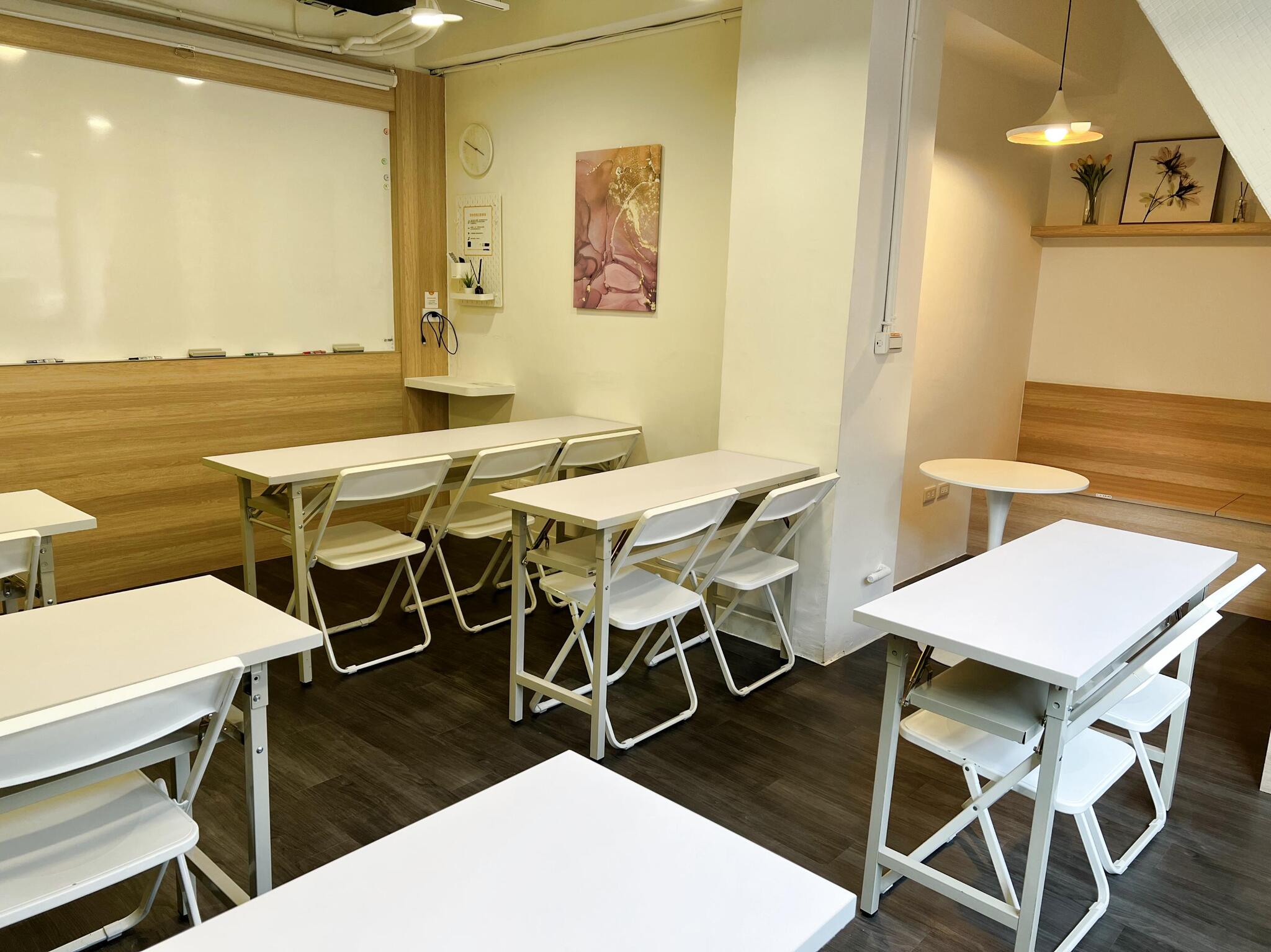 桌椅可容納20人,有小空間可做教師或助理休息室等運用,適合各式中小型活動、聚會、課程。